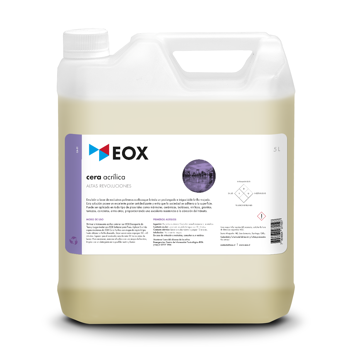 EOX Cera Acrilica Alto Brillo es un acabado para pisos a base de polimeros acrilicos que brinda un prolongado e inigualable brillo mojado. Esta solucion posee un excelente poder antideslizante y evita que la suciedad se adhiera a la superficie. Puede ser aplicado en todo tipo de pisos tales como marmoles, ceramicas, baldosas, vinilicos, granitos, terrazos, concretos, entre otros, proporcionando una excelente resistencia a la abrasion del transito. Es un producto facil de aplicar y mantener.