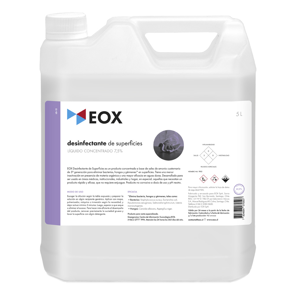 EOX Desinfectante de Superficies Concentrado es un producto de desinfeccion a base de sales de amonio cuaternario de 5a generacion (7,5% p/p), para eliminar todo tipo de bacterias, hongos y germenes en areas donde se requiere accion residual. Tiene una menor inactivacion en presencia de materia organica y una mayor eficacia en aguas duras. Desarrollado para ser usado en areas medicas, institucionales e industriales, en especial, aquellas que necesitan un producto economico gracias a su alto poder de dilucion (hasta 1:500), rapido y eficaz.